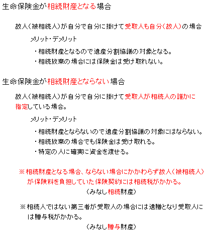 相続財産となった場合には相続財産の中に保険金も組み込む形となりますので遺産分割協議が必要となり、遺産とは別に特定の人に資金を残したい場合には不利となります。